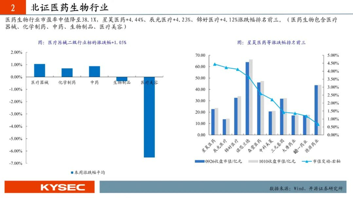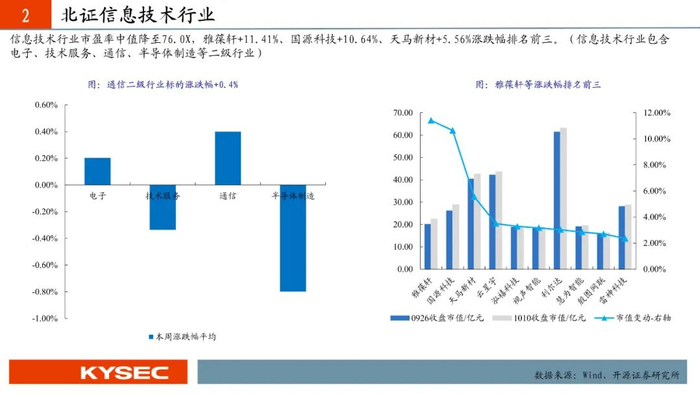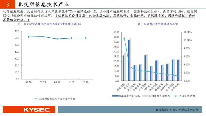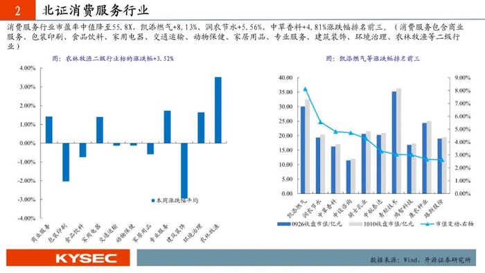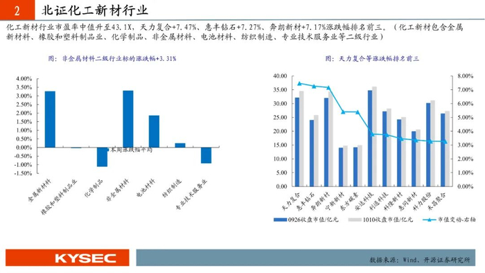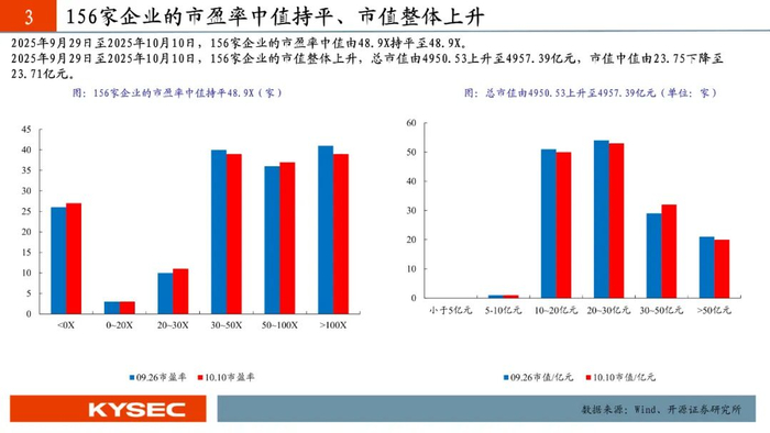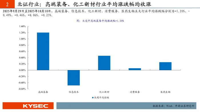 2025年9月29日至2025年10月10日,高端装备、信息技术、化工新材、消费服务、医药生物五大行业平均涨跌幅分别为+1.20%、-0.49%、+0.46%、+0.06%、+0.25%。高端装备行业市盈率中值升至41.4X,信息技术行业市盈率中值降至76.0X,化工新材行业市盈率中值升至43.1X,消费服务行业市盈率中值降至55.8X,医药生物行业市盈率中值降至38.1X。