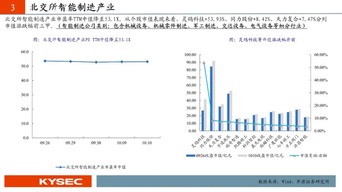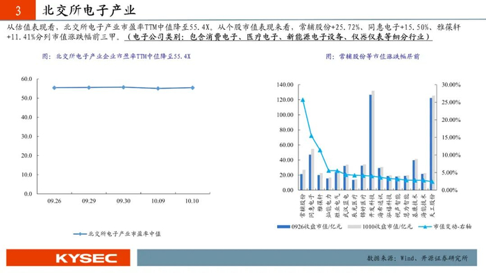 科技新产业156家企业中84家上涨,区间涨跌幅中值为+0.32%,灵鸽科技+53.93%,常辅股份+25.72%,同惠电子+15.50%,雅葆轩+11.41%,国源科技+10.64%位列涨幅前五。156家企业的市盈率中值由48.9X持平至48.9X。市值整体上升,总市值由4950.53上升至4957.39亿元,市值中值由23.75下降至23.71亿元。智能制造产业市盈率TTM中值降至53.1X。电子产业市盈率TTM中值降至55.4X。汽车产业市盈率TTM中值升至36.0X。信息技术产业市盈率TTM中值降至60.1X。