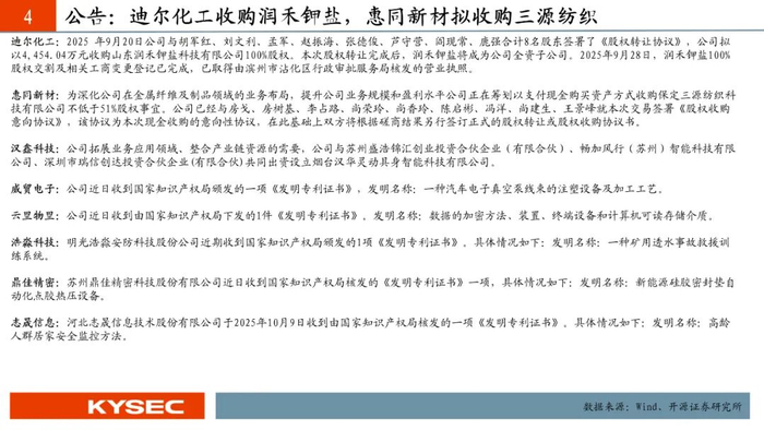 迪尔化工:拟以4,454.04万元收购山东润禾钾盐科技有限公司100%股权。9月28日,润禾钾盐100%股权交割及相关工商变更登记已完成。惠同新材:正在筹划以支付现金购买资产方式收购保定三源纺织科技有限公司不低于51%股权事宜。汉鑫科技:与苏州盛浩锦汇创业投资等共同出资设立烟台汉华灵动具身智能科技有限公司。威贸电子:发明名称:一种汽车电子真空泵线束的注塑设备及加工工艺。云里物里:发明名称:数据的加密方法、装置、终端设备和计算机可读存储介质。浩淼科技:发明名称:一种矿用透水事故救援训练系统。鼎佳精密:发明名称:新能源硅胶密封垫自动化点胶热压设备。志晟信息:发明名称:高龄人群居家安全监控方法。