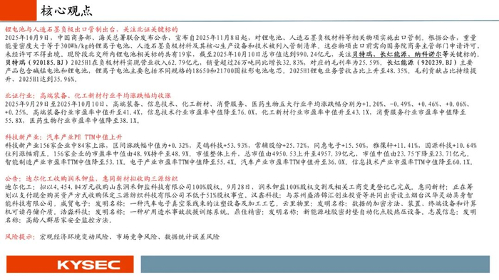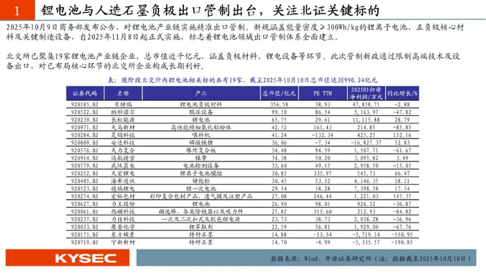 2025年10月9日,中国商务部、海关总署联合发布公告,宣布自2025年11月8日起,对锂电池、人造石墨负极材料等相关物项实施出口管制。根据公告,重量能量密度大于等于300Wh/kg的锂离子电池、人造石墨负极材料及其核心生产设备和技术被列入管制清单。这些物项出口前需向国务院商务主管部门申请许可,未经许可不得出境。现阶段北交所内锂电池相关标的共有19家,截至2025年10月10日总市值达到990.24亿元,关注贝特瑞、长虹能源、纳科诺尔等关键标的。贝特瑞(920185.BJ)2025H1在负极材料实现营业收入62.79亿元,销量超过26万吨同比增长32.83%,对应的毛利率为25.59%。长虹能源(920239.BJ)主要产品包含碱锰电池和锂电池,锂离子电池主要包括不同规格的18650和21700圆柱形电池电芯。2025H1锂电业务营收占比上升至48.35%。毛利贡献占比持续提升,2025H1达到35.96%。